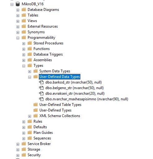 Versiyon 16'da bazı özel alan tiplerimiz bulunmaktadır. Bunları SQL Server Management Studio'dan aşağıdaki gibi görebilirsiniz. (Örnek: dbo.belgeno_str (nvarchar(20), null)