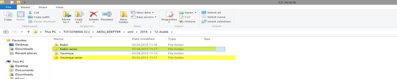 2 – Yevmiye yada Kebir dosyaları oluştur işlemi sonrasında ilgili aya ait katalog içerisinde Kebir-error / Yevmiye-error katalogları oluşacaktır.