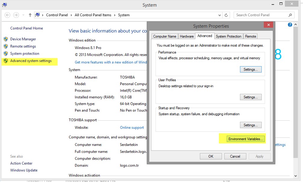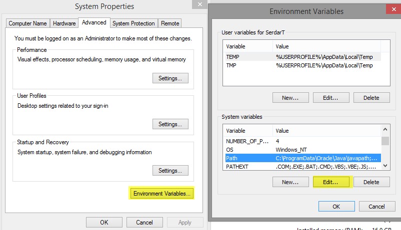 1- System\System Properties içerisindeki Environment Variables seçeneğine tıklanmalı