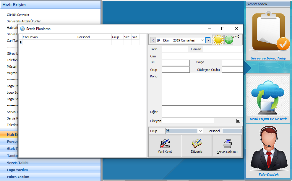 Servis Takip (Planlama , Servis Formları , Uzak erişim , Süreç yönetimi, Teledestek) Yazı gezinmesi e-Fatura,e-Arşiv,e-İrsaliye Tasarım – Özelleştirme Yazılımları Kalite Yönetim Sistemi